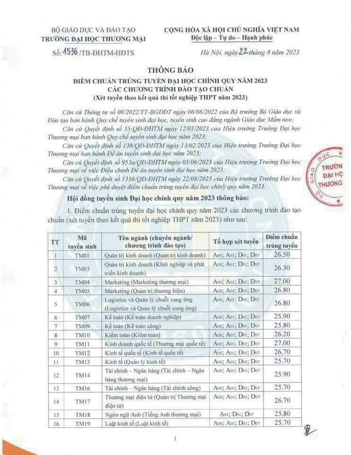 Trường Đại học Thương mại thông báo điểm chuẩn trúng tuyển đại học chính quy năm 2023 các chương trình đào tạo chuẩn (xét tuyển theo kết quả thi tốt nghiệp trung học phổ thông 2023).