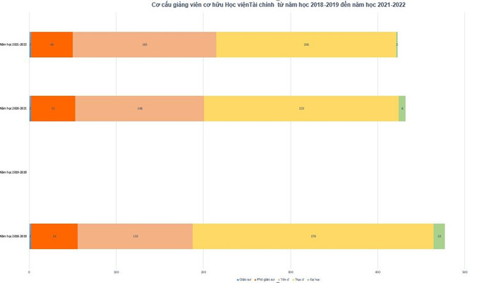 Như vậy, theo số liệu này, từ năm học 2018-2019 đến năm học 2021-2022, tổng số giảng viên cơ hữu của Học viện Tài chính giảm 54 người (11,3%). Trong đó, giáo sư không đổi; giảm 6 phó giáo sư (11,1%); tăng 33 tiến sĩ (25%).