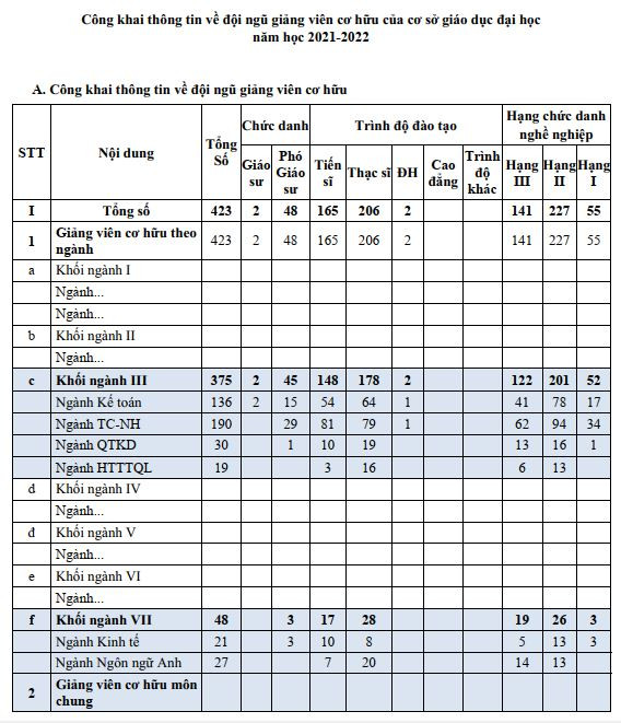 Mặt khác, theo báo cáo công khai năm học 2021-2022, giảng viên cơ hữu theo ngành là 213 mà riêng khối ngành III lại có tổng 220 giảng viên. Điều đó cho thấy, số liệu thống kê cơ cấu giảng viên cơ hữu còn khập khiễng.