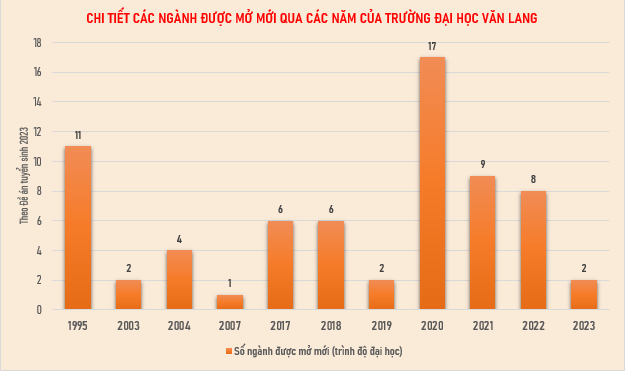 Đáng chú ý, năm 2020 là năm học ghi nhận số lượng các ngành bắt đầu đào tạo có số lượng lớn nhất - 17 ngành. Từ năm 2020 đến năm 2023, trong vòng 4 năm, tổng số ngành đào tạo được Trường Đại học Văn Lang mở mới là 36 ngành.