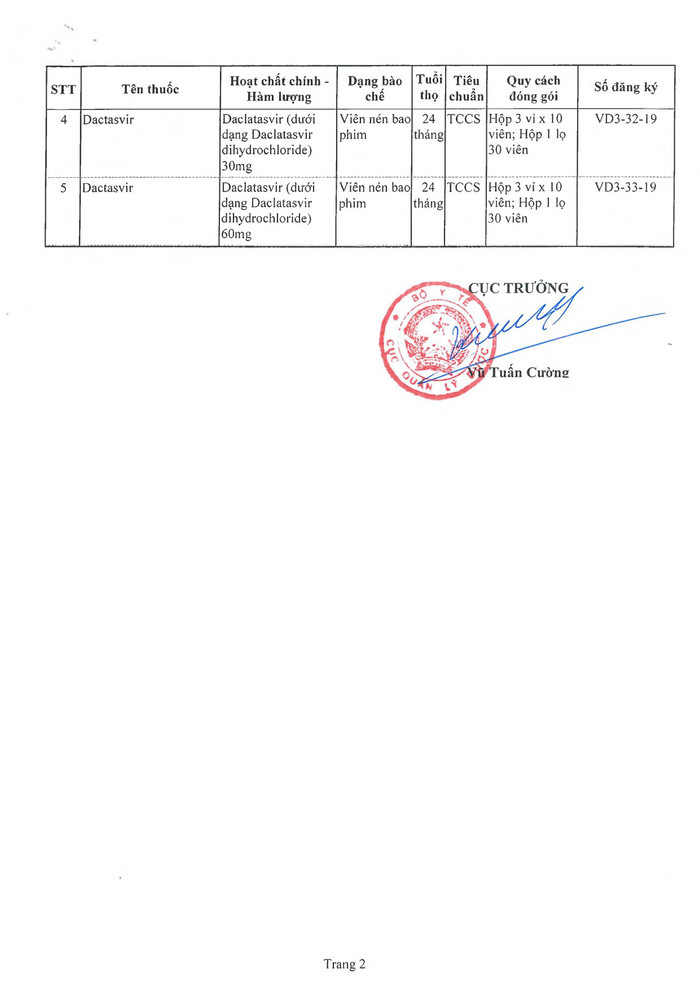 Đối với thuốc số thứ tự 02, 03, 04, 05 (chứa hoạt chất daclatasv dihydrochlorid) tại Danh mục ban hành kèm theo Quyết định này, cơ sở phải gửi mẫu thuốc kèm theo chất chuẩn đối với 03 lô sản xuất đầu tiên để Viện Kiểm nghiệm thuốc Trung ương hoặc Viện Kiểm nghiệm thuốc Thành phố Hồ Chí Minh kiểm tra theo tiêu chuẩn chất lượng đã đăng ký, chỉ được lưu hành sau khi kết quả kiểm nghiệm đạt yêu cầu.