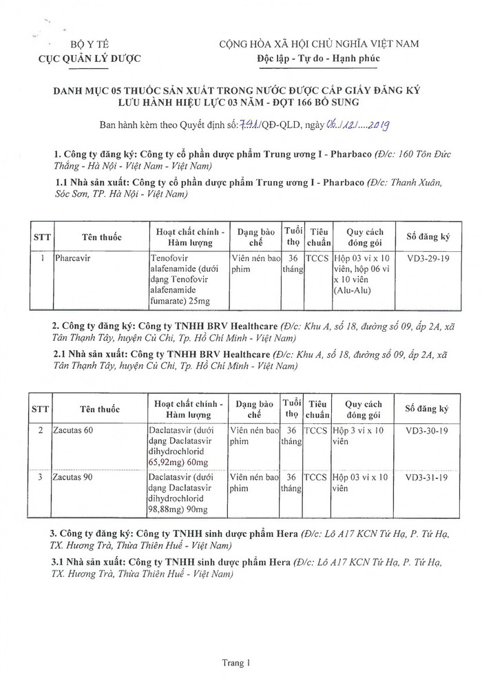 Đối với thuốc số thứ tự 01 tại Danh mục ban hành kèm theo Quyết định này: phải cập nhật tờ hướng dẫn sử dụng theo tờ hướng dẫn sử dụng thuốc Vemlidy đã được Cơ quan Quản lý Dược Châu Âu (EMA) phê duyệt trong thời hạn 03 tháng kể từ ngày ký ban hành Quyết định này và chỉ được sản xuất, lưu hành sau khi được Cục Quản lý Dược phê duyệt nội dung này.