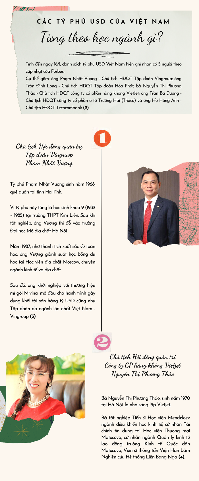 Thời gian vừa qua, không ít học sinh lớp 12 gửi chia sẻ về cho Tạp chí điện tử Giáo dục Việt Nam bày tỏ sự ngưỡng mộ với các tỷ phú USD của Việt Nam. Quá trình học tập, khởi nghiệp và kinh doanh của các tỷ phú là câu chuyện truyền cảm hứng, gieo ước mơ cho rất nhiều học sinh, sinh viên phấn đấu, nỗ lực. Cùng với đó, các em cũng mong muốn được biết rõ hơn các tỷ phú từng theo học ngành nào?