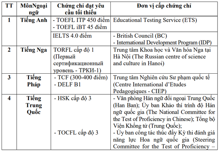 Thí sinh có một trong các chứng chỉ ngoại ngữ (giống hoặc khác với môn Ngoại ngữ đang học tại trường phổ thông) hợp lệ, có giá trị sử dụng ít nhất đến ngày 27/06/2023 và đạt mức điểm tối thiểu theo bảng dưới đây: