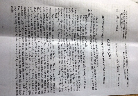 Trong cáo trạng của Viện Kiểm sát số 393/CT2-VKS-P1 ngày 05/9/2014 tại phần đầu trang 6 mặc dù không phủ nhận thô thiển như CQĐT nhưng cũng suy diễn: “Ngày 30/01/2010, Tuyết mới mở tài khoản số 086.10.00082.002 tại Ngân hàng TMCP An Bình – Phòng giao dịch Nguyễn Văn Trỗi. Ngày 05/01/2010 là ngày Yee Lip Chee ký bản cam kết thì làm sao biết được trước số tài khoản của Tuyết mở ngày 30/01/2010 để ghi vào trong bản cam kết ngày 05/01/2010”.