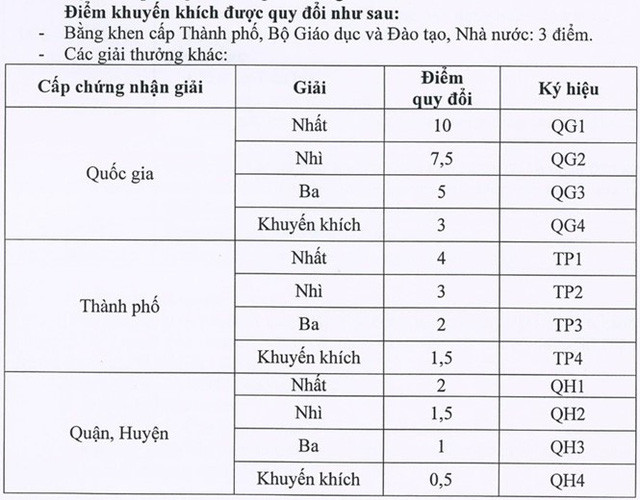 Điểm khuyến khích dành cho những học sinh được tặng bằng khen cấp thành phố, Bộ Giáo dục và Đào tạo, Nhà nước và những học sinh đạt thành tích cá nhân và đồng đội theo quy định của Sở Giáo dục và Đào tạo Hà Nội về thông tin các cuộc thi, Olympic dành cho học sinh phổ thông (ban hành ngày 10/8/2016) và Công văn số 4520 về thông tin các cuộc thi dành học học sinh phổ thông từ năm học 2017 - 2018 (ban hành ngày 22/12/2017).