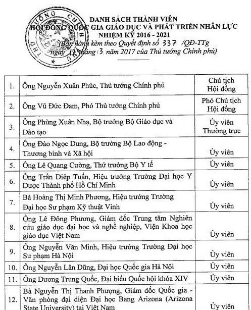 Trước đó, ngày 20/3, Thủ tướng Chính phủ quyết định thành lập Hội đồng Quốc gia Giáo dục và Phát triển nhân lực nhiệm kỳ 2016 - 2021 gồm 26 thành viên.