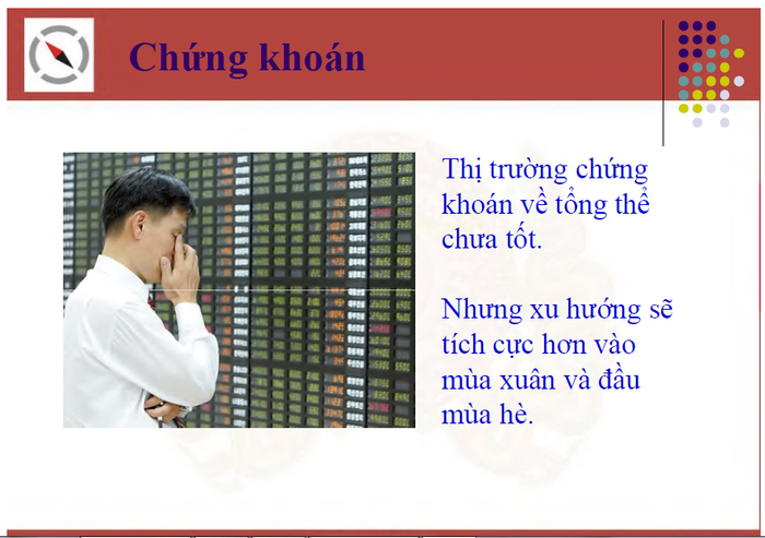 Về chứng khoán, năm 2013 chứng khoán sẽ diễn biến khó lường, những thời điểm mang lại lợi nhuận sẽ rơi vào mùa xuân và đầu hè, thời điểm mùa thu và mùa đông cần có những điểm nút để dự báo.