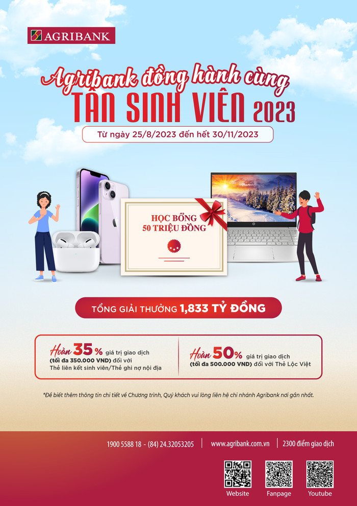 Để chào đón tân sinh viên năm học 2023-2024 tại tất cả các trường đại học, cao đẳng trên cả nước, Agribank triển khai chương trình khuyến mại “Agribank đồng hành cùng tân sinh viên năm 2023” với tổng giá trị giải thưởng lên đến hơn 1,8 tỷ đồng.