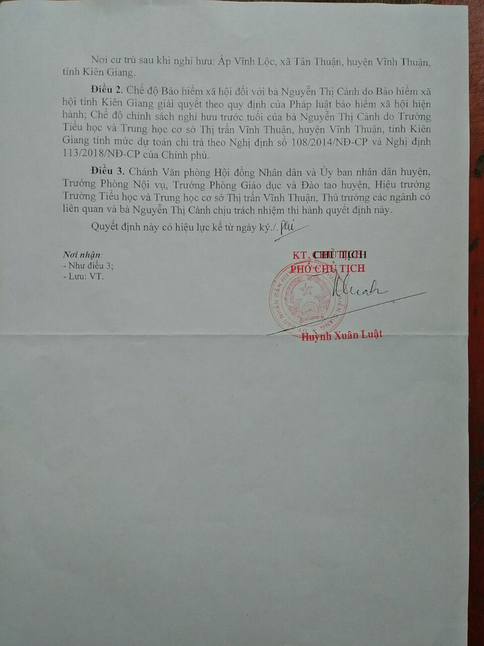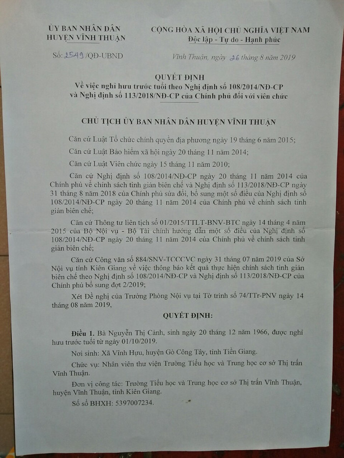 Ngày 26/8/2019, cô Nguyễn Thị Cảnh được Ủy ban Nhân dân huyện Vĩnh Thuận ban hành Quyết định số 2549/QĐ-UBND về việc nghỉ hưu trước tuổi theo Nghị định 108/2014/NĐ-CP và Nghị định số 113/2018/NĐ-CP của Chính phủ đối với viên chức.