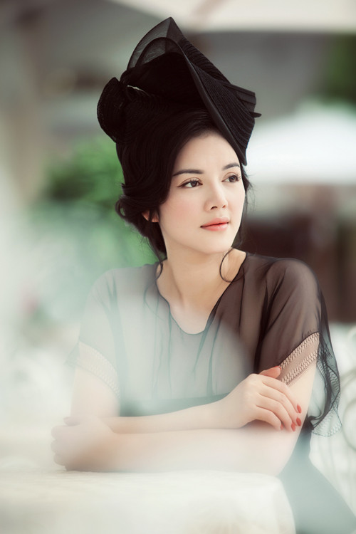 | Chiếc mũ đen có chất liệu dày dặn, tạo khối hình hoa cách điệu hòa quyện cùng chiếc đầm đen có điểm nhấn phần trên bằng cách đổi chất liệu vải sheer bên trên và lụa bên dưới tạo ra những khối màu đen đồng nhất mà vẫn khác biệt về sắc độ. |