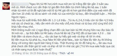 "Giá bên Mỹ là 386$ thuế khoảng 8.5%, tiền chuyển về Việt Nam và lãi, nhìn vào biết ngay là làm gì có giá 5 triệu...Michael Kors fake thì cũng nhan nhản ra thật, từ mấy trăm đến 1 triệu cũng có. Nhưng giá sale Michael Kors rẻ nhất là 280$ tính ra VND đã là gần 6 triệu chưa kể tiền ship từ Mỹ về Việt Nam mà bán giá 5 triệu cũng là phải đặt dấu hỏi?", độc giả July Kate bày tỏ.
