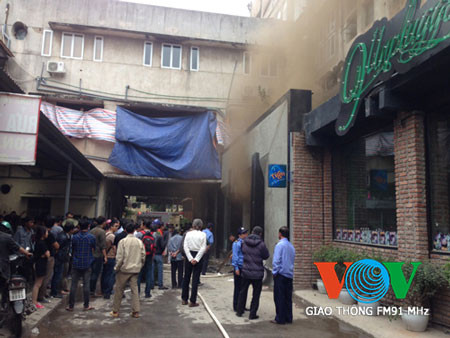 | Khói bốc ra từ quán bar đang thi công, tại thời điểm đám cháy chưa bị dập tắt. Ảnh: VOV |