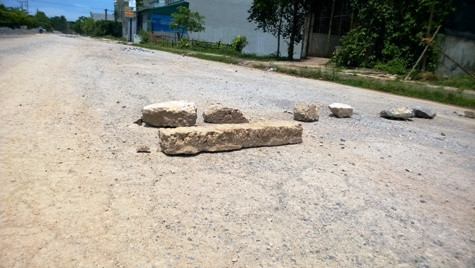 Để hạn chế xe quá tải lưu thông, nhiều hộ dân đã đem gạch đá, chắn ngang đường |