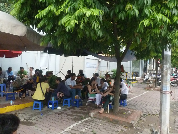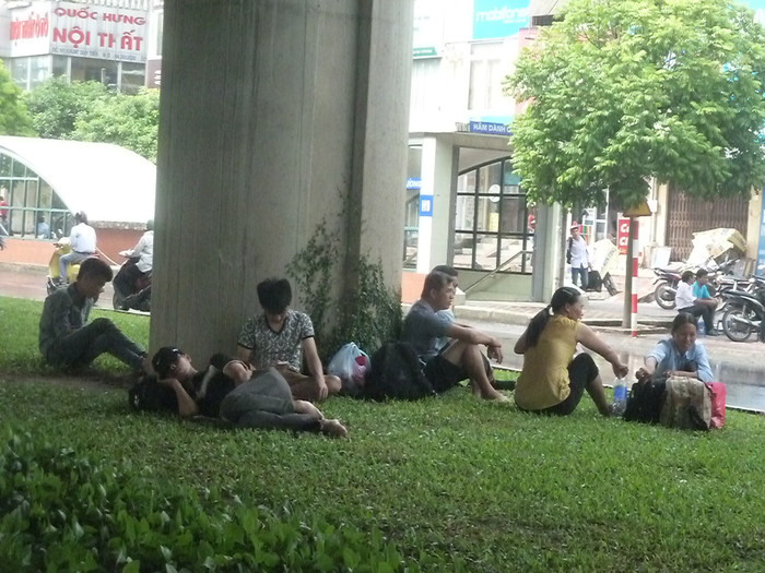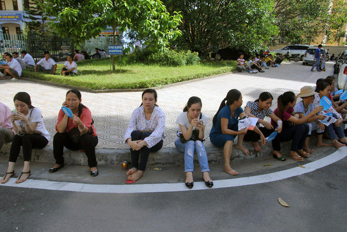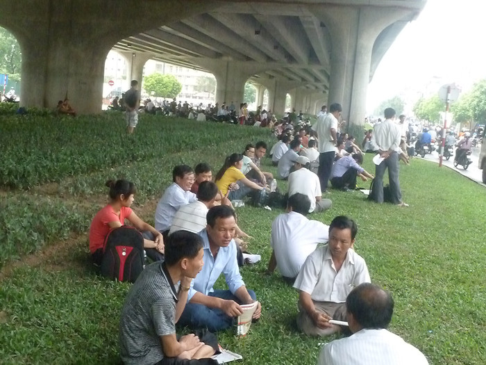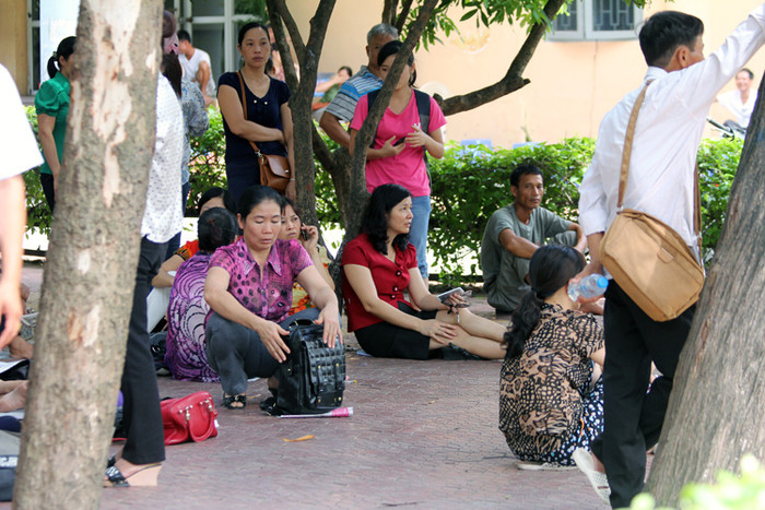 Phụ huynh tìm quán nước nghỉ chân, tranh thủ ngồi dưới gốc cây, tìm chút bóng râm dưới mái cầu dành cho người đi bộ, ngồi trên bãi cỏ dưới đường cao tốc trên cao, thậm chí có những phụ huynh mặc áo nắng ngồi luôn trên xe máy chờ con...