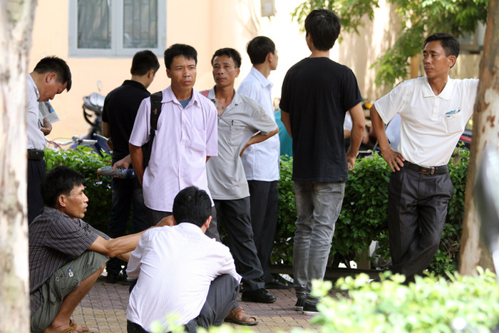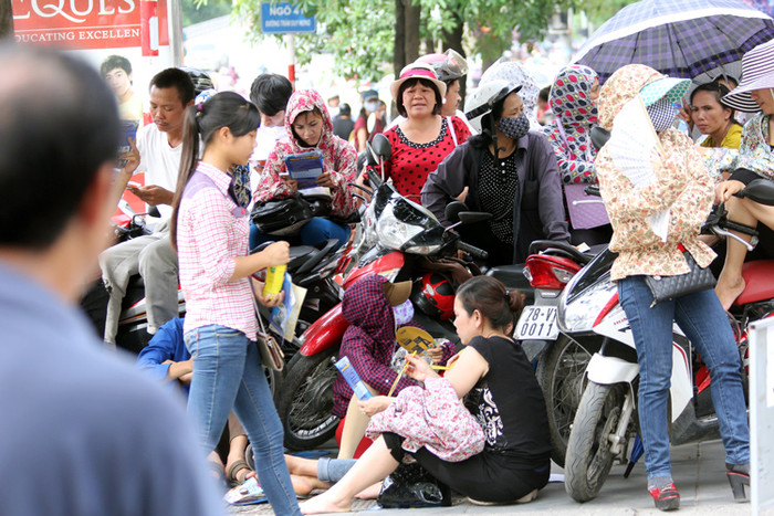 | Phụ huynh tìm bóng mát dưới tòa nhà cao tầng ngồi chờ con thi tại điểm thi Trường Đại học Sư phạm Hà Nội |