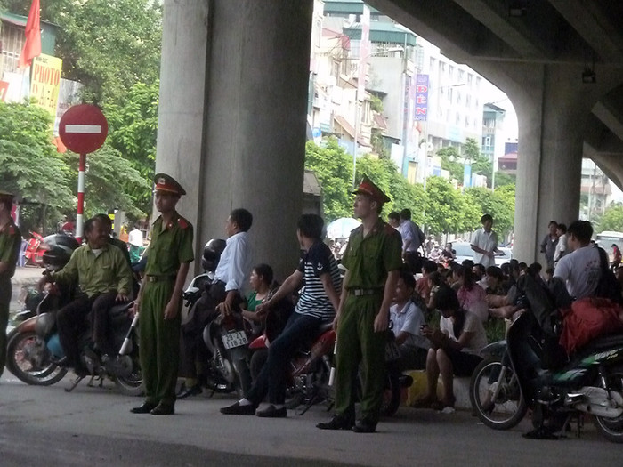 | Bố đội mũ, tấp xe đạp vào bên đường ngồi chờ con thi tại điểm thi Trường Trung cấp Cảnh sát Nhân dân 1 |