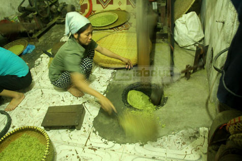 | rồi xay sạch vỏ trấu. Và lúc này cốm có màu trắng vàng, chưa có màu xanh... |