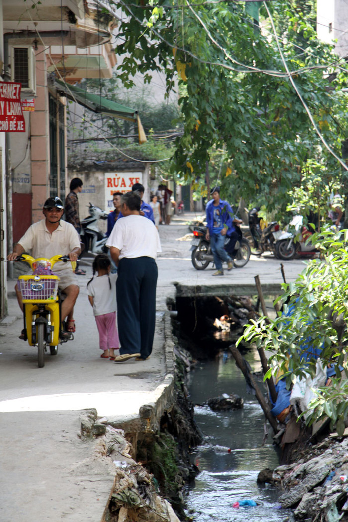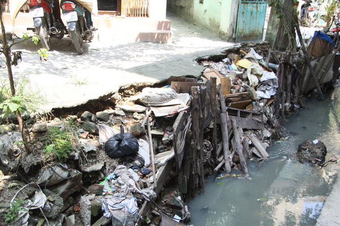 | Những chiếc cầu tạm bợ bắc qua con mương đen này được người dân dựng lên để đi tạm trong khi "đợi chờ trong mỏi mòn" dự án cải tạo con mương đen này được thực hiện. |