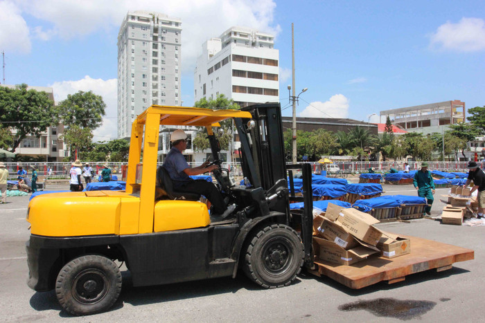 | Hàng tấn pháo hoa được tập kết tại cảng Sông Hàn, đối diện khách sạn Novotel và Trung tâm Hành chính Thành phố Đà Nẵng... |