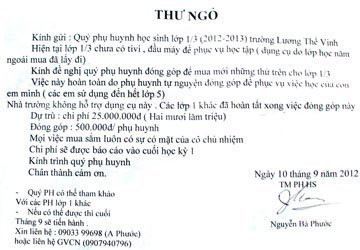 Có phụ huynh từng nói rằng: Có những năm học mà anh nhận được đến 4 lần thư ngỏ (thư ngỏ xin phụ huynh hỗ trợ tiền lót nền sân trường; thư ngỏ xin hỗ trợ mua máy chiếu; thư ngỏ xin phụ huynh hỗ trợ văn nghệ nhà trường; thư ngỏ xin phụ huynh hỗ trợ học sinh khó khăn).