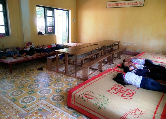 Tại điểm trường chính, mỗi ngày, hơn 50 em học sinh phải nghỉ trưa tại trường trong một phòng bán trú gần 50m2, do nhà trường trang bị.