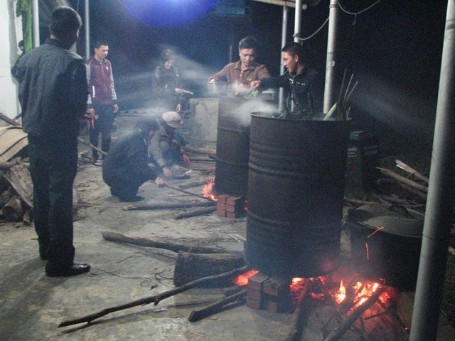Gần 6 giờ tối, ba thùng phuy chứa đầy bánh chưng được bắc lên bếp và bắt đầu nổi lửa, các chiến sỹ Bộ đội Biên phòng và người nhà Đại tướng lại quây quần bên bếp lửa trò chuyện để chờ bánh chín.