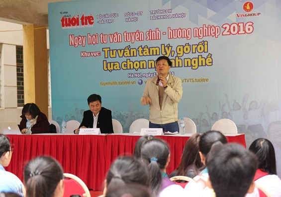 Ở khu vực tư vấn tâm lý-gỡ rối lựa chọn nghề nghiệp, TS. Phạm Mạnh Hà (Phó trưởng khoa Công tác thanh niên của Học viện thanh thiếu niên Việt Nam) hỗ trợ các em chuẩn bị kỹ năng sống, tâm sinh lý để chọn ngành nghề phù hợp và thông minh nhất.