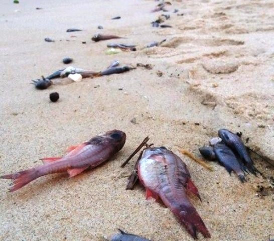 | Cá chết bất thường trôi dạt vào bờ biển Nhật Lệ (Ảnh: Thủy Phan) |