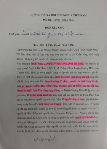 Vừa qua, Báo điện tử Giáo dục Việt Nam nhận được đơn kêu cứu của bà Lê Thị Oánh, trú tại thôn 7, xã Hoằng Thành, huyện Hoằng Hóa, tỉnh Thanh Hóa về việc con trai bà là Lê Xuân Nhạ (sinh ngày 04/4/1984) đã bị Công an huyện Hoằng Hóa khởi tố "oan" tội đánh bạc và bắt tạm giam 3 tháng.