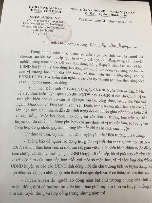 Từ đó, UBND huyện Yên Định yêu cầu các trường, thông báo để người lao động trong đơn vị biết chủ trương năm học 2016-2017.