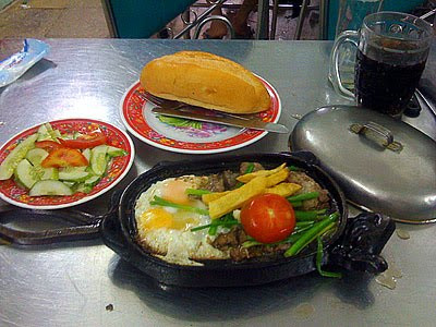| Bánh mì Huế được làm bằng bột pha theo công thức gia truyền. Vỏ bánh mì vàng ruộm, giòn tan, nhưng ruột bánh lại trắng như bông, ăn vào vừa mềm lại có độ dai vừa phải. Một suất bánh mì bít tết đầy đủ từ thịt bò bít tết, xíu mại, trứng ốp, bánh mỳ cho đến đĩa dưa chuột chua ngọt giòn tan. |