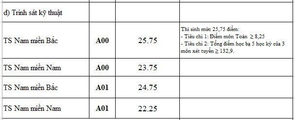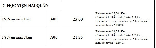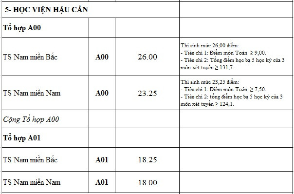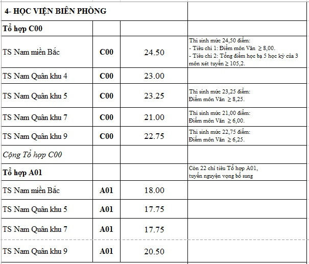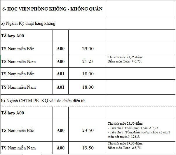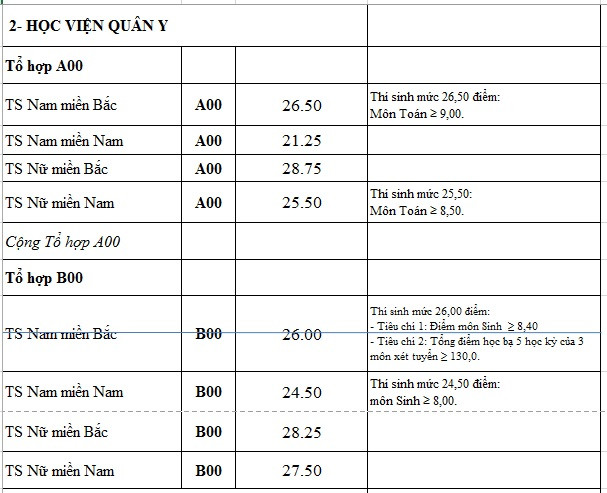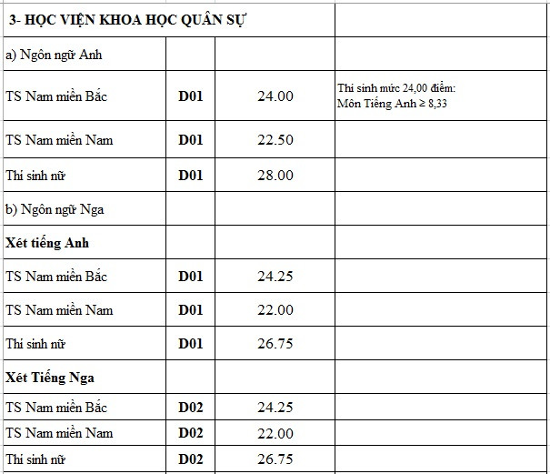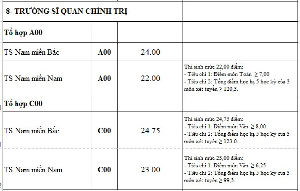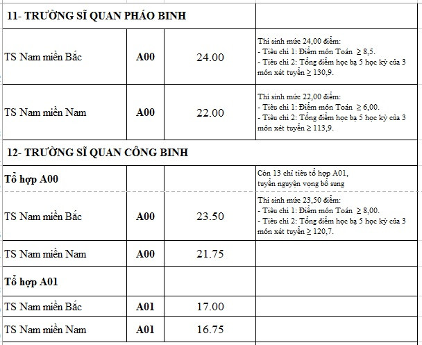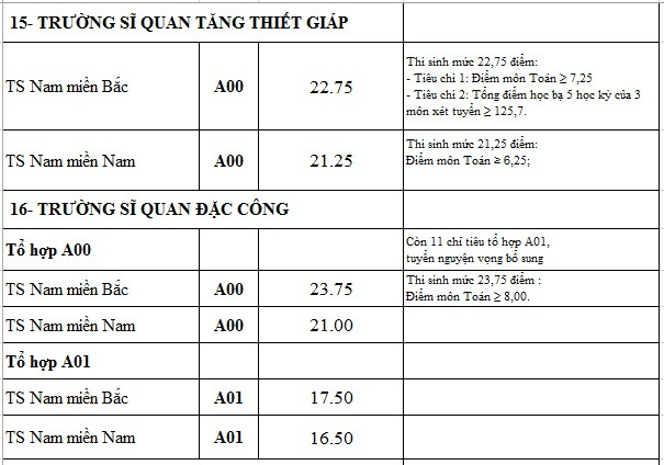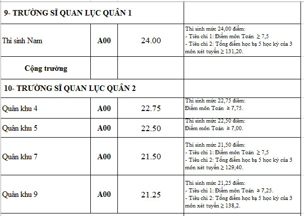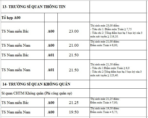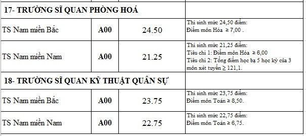 Điểm trúng tuyển chi tiết của 18 trường khối Quân đội như sau: