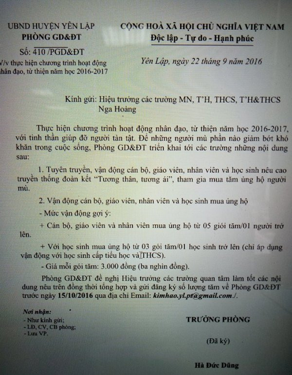 Theo Văn bản số 410/PGD&ĐT về việc thực hiện chương trình hoạt động nhân đạo, từ thiện năm học 2016-2017 gửi đến các trường mầm non, tiểu học, trung học cơ sở, mỗi cán bộ, giáo viên, nhân viên, học sinh phải ủng hộ theo mức “gợi ý” đã được nêu trong văn bản.