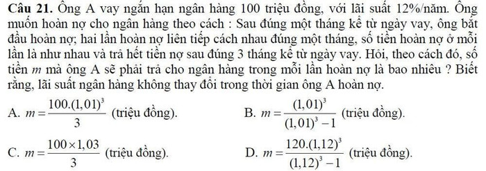 Giả sử người làm bài vượt qua được hai “cửa ải” trước để tính theo đúng ý ngân hàng, đến bước cuối cùng vẫn còn một thử thách nếu học sinh chưa làm thì không hề đơn giản, đó là, khi tính toán sẽ xuất hiện một đại lượng có thể biểu diễn theo ba cách như sau: