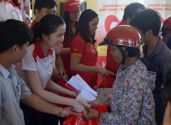 | Đại diện cán bộ nhân viên HDBank và Vietjet người dân chịu thiệt hại sau lũ ở tỉnh Quảng Bình và Hà Tĩnh. |