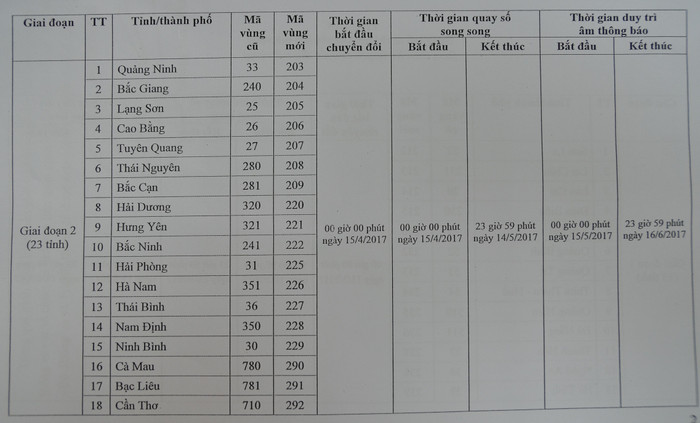 | Danh sách mã vùng điện thoại cố định của các tỉnh, thành phố trong giai đoạn 2 từ 15/4/2017 |