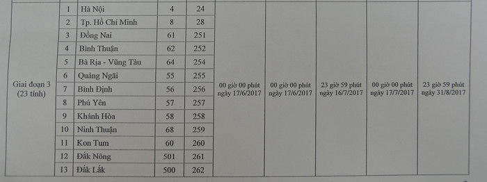 Giai đoạn 3 từ 17/6 áp dụng cho 23 tỉnh thành tỉnh, thành phố còn lại: Thủ đô Hà Nội, TP.Hồ Chí Minh, Đồng Nai, Bình Thuận, Bà Rịa-Vũng Tàu, Quảng Ngãi, Bình Định, Phú Yên, Khánh Hòa, Ninh Thuận, Kon Tum, Đắk Nông, Đắk Lắk, Lâm Đồng, Gia Lai, Vĩnh Long, Bình Phước, Long An, Tiền Giang, Bình Dương, Bến Tre, Tây Ninh, Đồng Tháp.