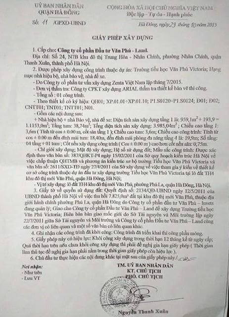 Tìm hiểu của phóng viên, công trình trên đã được cấp Giấy phép xây dựng số 11/GPXD-UBND ngày 29/10/2015, chủ đầu tư công trình là Công ty Cổ phần đầu tư Văn Phú – Land.