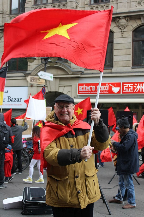 Có cả những người bạn quốc tế cùng tham gia biểu tình. Ông Courtial quấn cờ đỏ sao vàng trên vai, tay ông còn phất cao lá cờ Việt Nam để thể hiện tình đoàn kết, vì hòa bình và công lý!