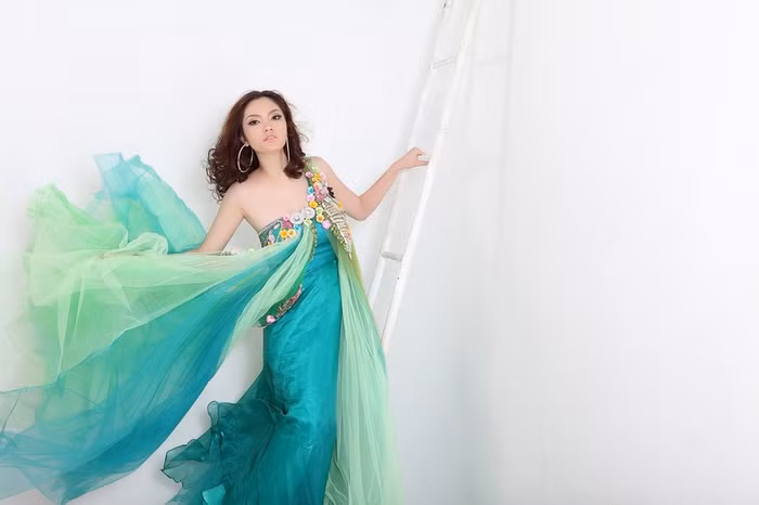 | Với ý tưởng gần gũi thiên nhiên, đội ngũ thiết kế H&H Studio đã chọn màu xanh hoa lá làm nền chủ đạo cho bộ áo dạ hội độc đáo. |