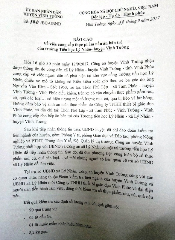 | Báo cáo số 340/BC-UBND của Ủy ban nhân huyện Vĩnh Tường, tỉnh Vĩnh Phúc về vụ việc (ảnh Nhân Minh) |