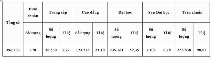 Theo báo cáo của Bộ Giáo dục và Đào tạo, tính đến tháng 01/2018, trình độ giáo viên tiểu học về cơ bản đã đạt trên Chuẩn so với quy định. Cụ thể số lượng, tỷ lệ trình độ đào tạo giáo viên tiểu học cả nước như sau: