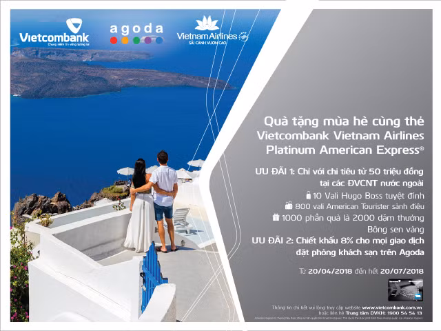 Trong thời gian từ ngày 20/4/2018 đến hết ngày 20/7/2018, Vietcombank triển khai chương trình Quà tặng mùa hè dành riêng cho các chủ thẻ Vietcombank Vietnam Airlines Platinum American Express® chi tiêu tại nước ngoài với nhiều ưu đãi hấp dẫn.
