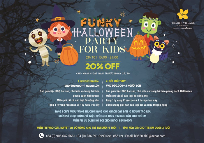 Nếu bạn đang tìm kiếm một điểm chơi Halloween để cả nhà vừa được ăn ngon, lại vừa được vui chơi đã đời, lại miễn phí cho trẻ nhỏ, thì hai gói ưu đãi vô cùng hấp dẫn từ Premier Village Danang resort là sự lựa chọn không thể tuyệt vời hơn.
