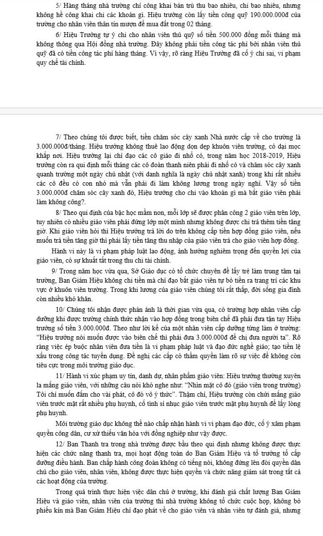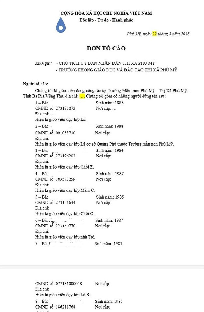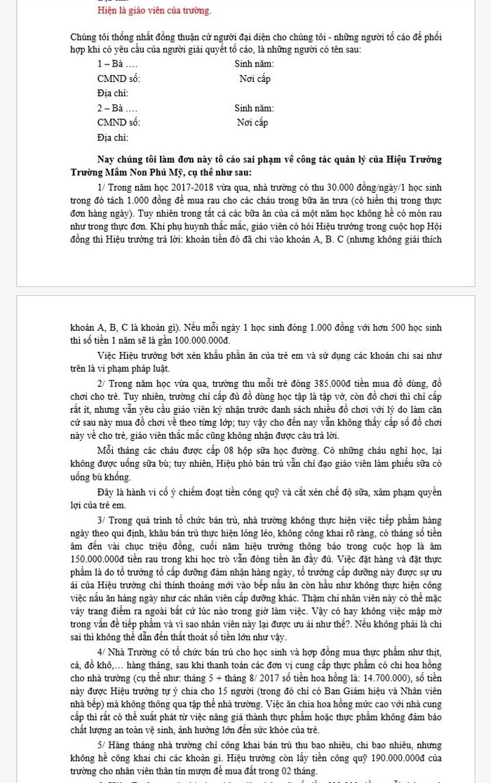 | Tháng 8 vừa qua, 11 giáo viên của Trường Mầm non Phú Mỹ đã đứng đơn tố cáo hiệu trưởng Nguyễn Thị Thanh Liêm vi phạm 12 nội dung về công tác quản lý và thu chi tài chính. Ảnh do tác giả cung cấp |