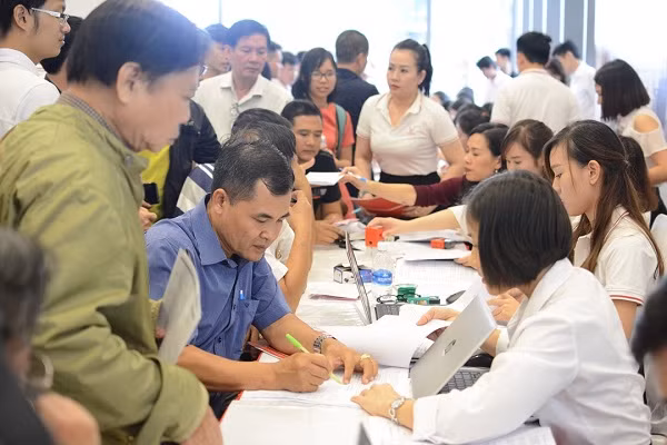 | Khu vực làm thủ tục đặt cọc xe ô tô VinFast đông kín khách hàng. |