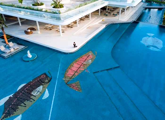 Trái tim của condotel là bể bơi trung tâm tràn bờ rộng 5000m2 với nhiều cấp độ thoải dần ra phía biển. Từ mép nước hồ bơi, cảm giác với tay ra là chạm vào biển cả.