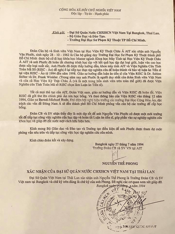 Theo thư giới thiệu bảo đảm của Giáo sư, Tiến sĩ Sabine Stifter tại Viện RISC –Linz, anh Phước là người duy nhất của Viện Kỹ Thuật Châu Á (và là một trong bốn sinh viên trên toàn thế giới, ‘top ten percent’) được Viện Nghiên cứu Tính Toán Mã số RISC chọn, chấp thuận làm nghiên cứu sinh, làm luận án Tiến sĩ tại Áo.