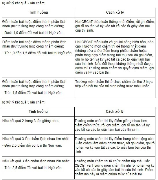 Sau khi chấm thi hai lần thì sẽ tiến hành xử lý kết quả chấm và làm biên bản chấm thi. Thành viên Ban Thư ký Hội đồng thi, Trưởng môn chấm thi, cán bộ chấm thi của Hội đồng thi so sánh kết quả chấm thi và xử lý như sau: